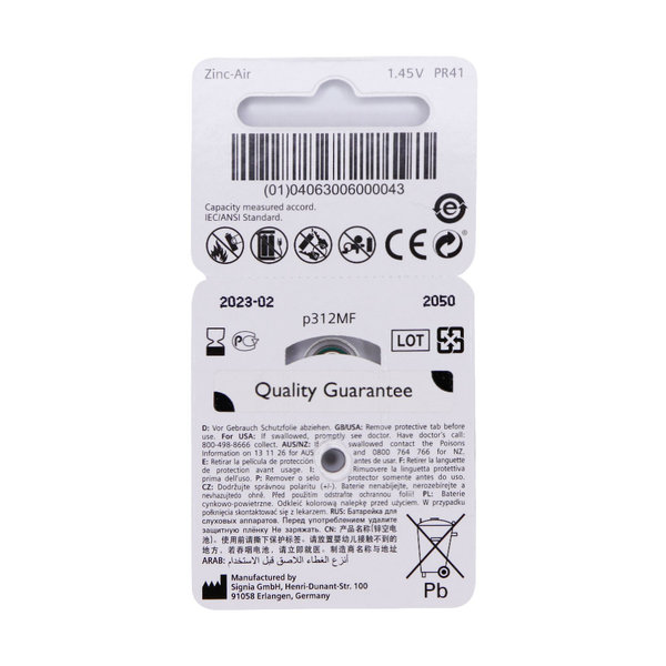 باتری سمعک شماره 312 سیگنیا 6 عددی